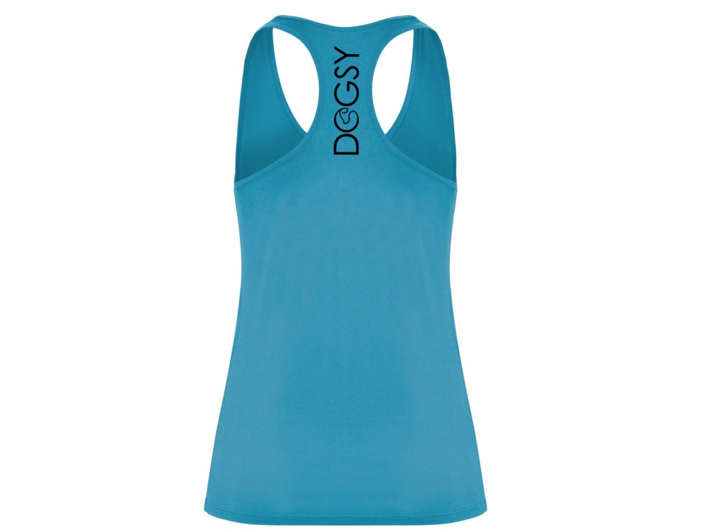Dámské sportovní tílko v modré barvě s motivem tlapky s činkou na přední straně a nápisem Dogsy na zadní straně - dejte najevo svou lásku ke sportu a zvířatům!