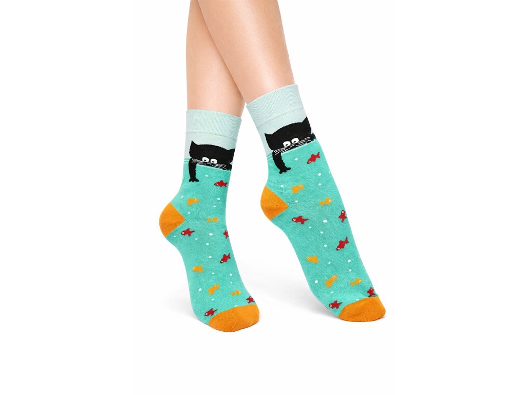 Tyrkysové ponožky s černou kočičkou, která zvědavě sleduje malé rybičky, vyprávějí příběh každé zachráněné tlapky. Příběh o druhé šanci. O misce plné lásky. O bezpečném domově. ❤️🩹