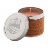 Vonná svíčka v kovové krabičce omotané provázkem. Na víčku svíčky je umístěné logo útulku.